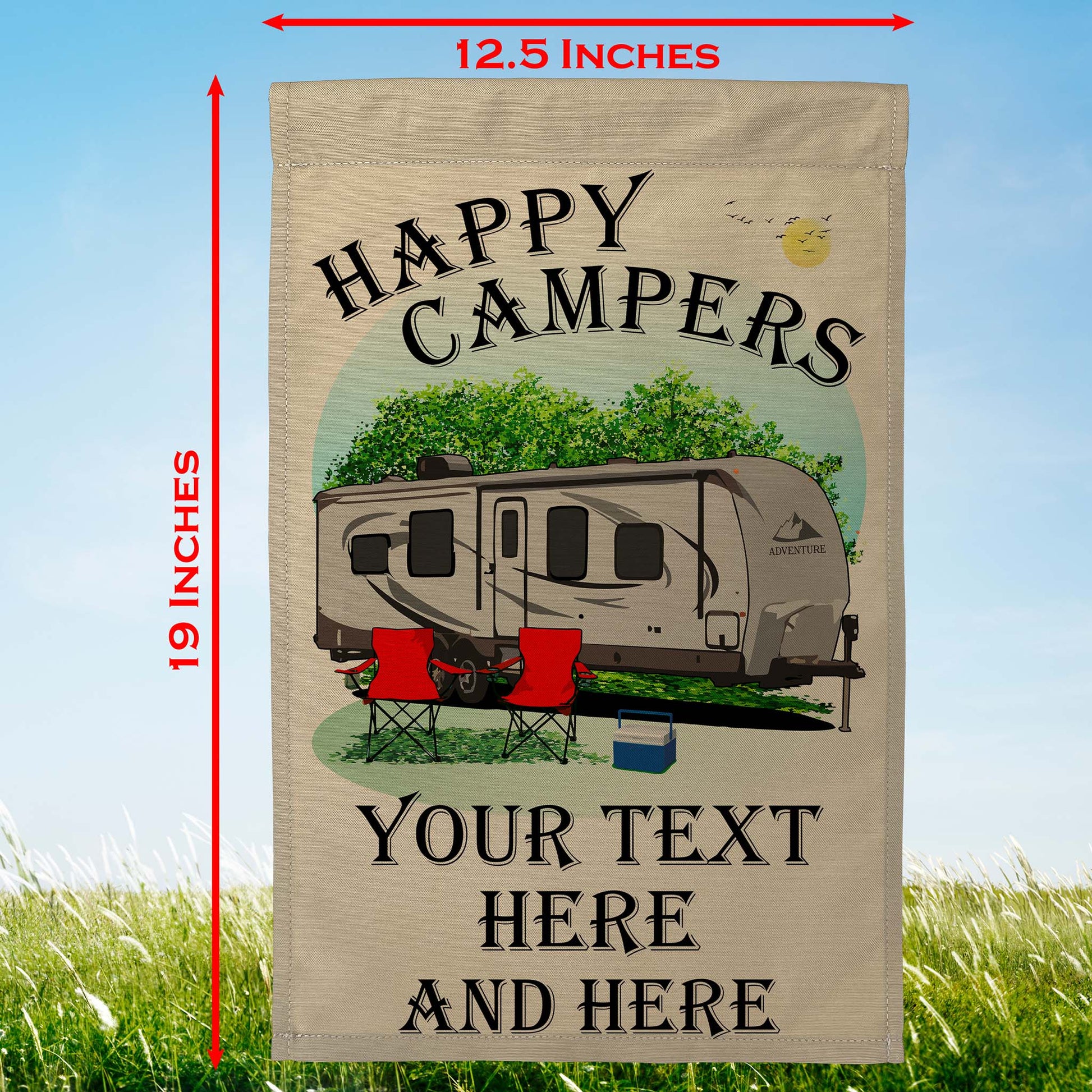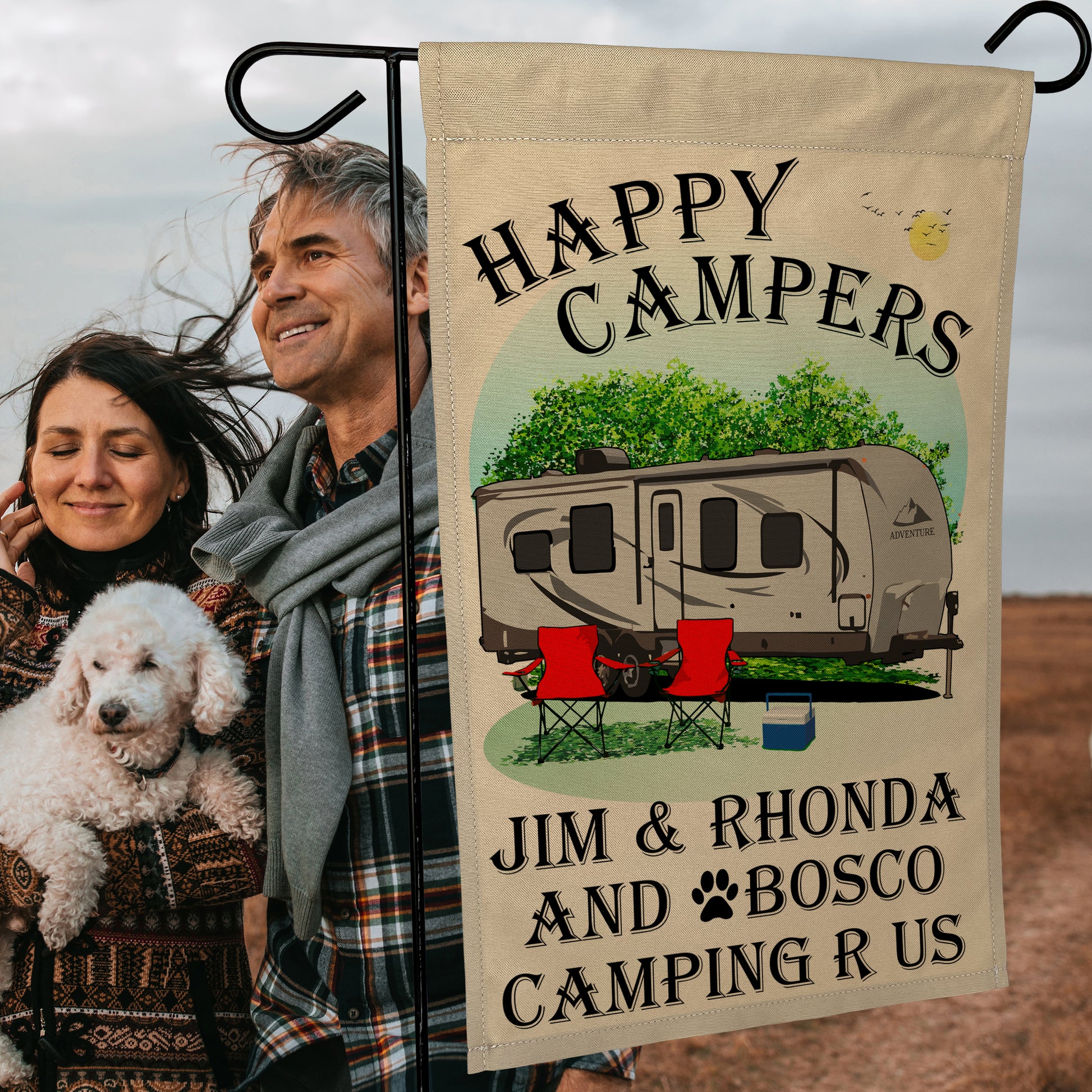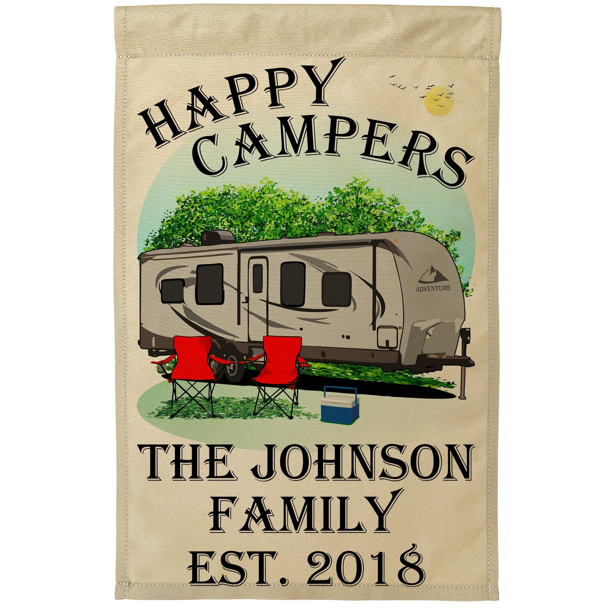 “Happy Campers” Personalized Camping Flag – Travel Trailer Design on Tan Fabric