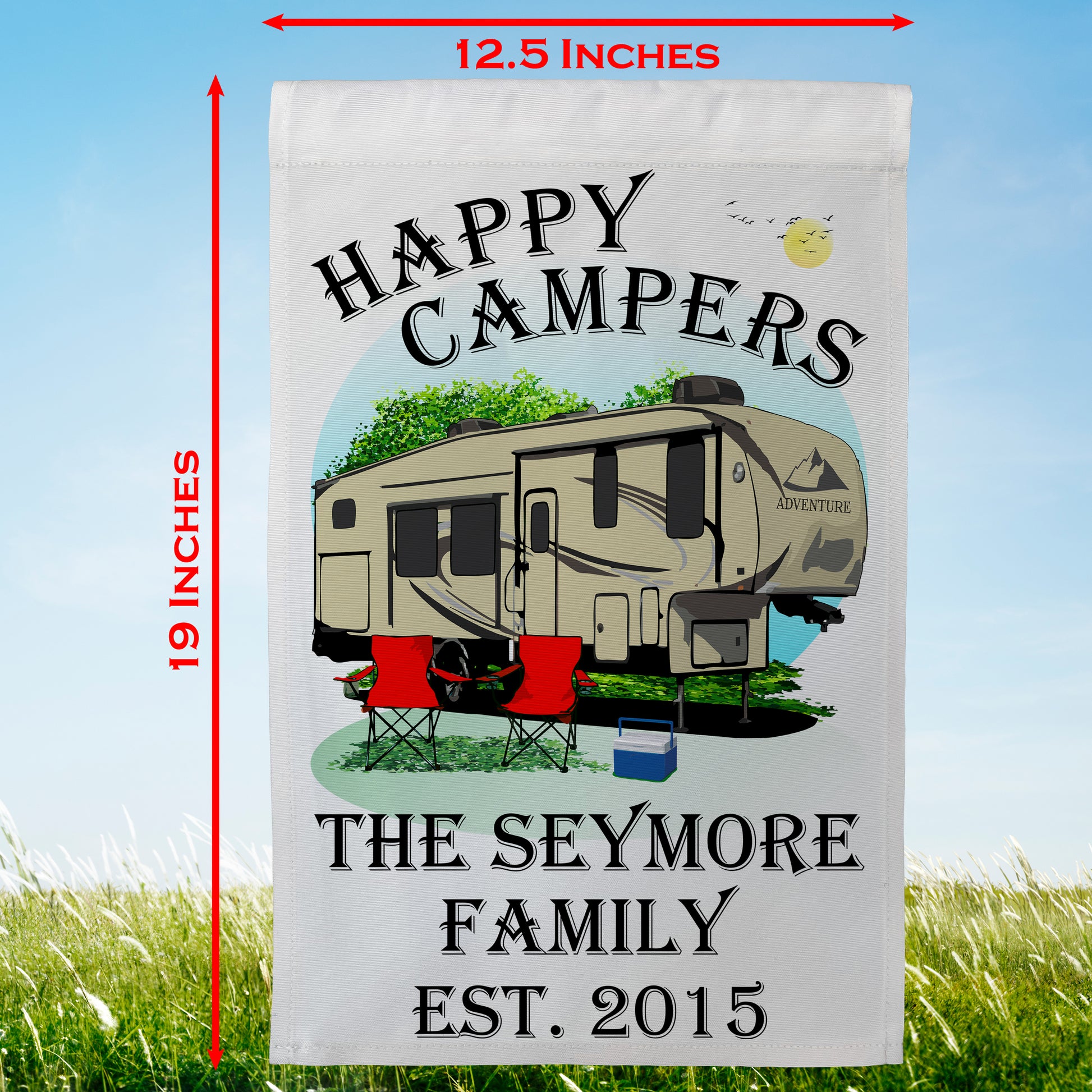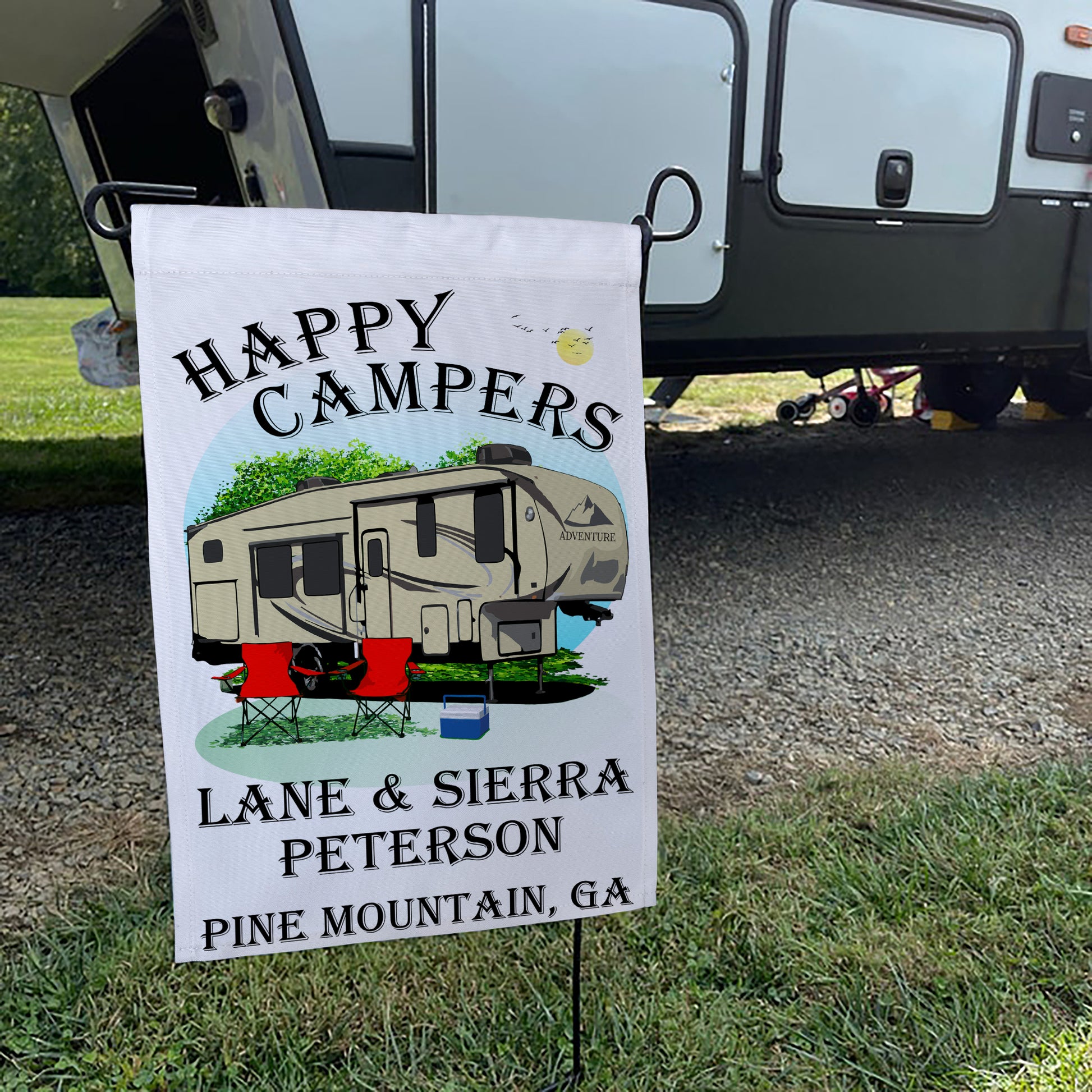 "Happy Campers" Personalized Camping Flag with 5th Wheel Trailer on White Fabric