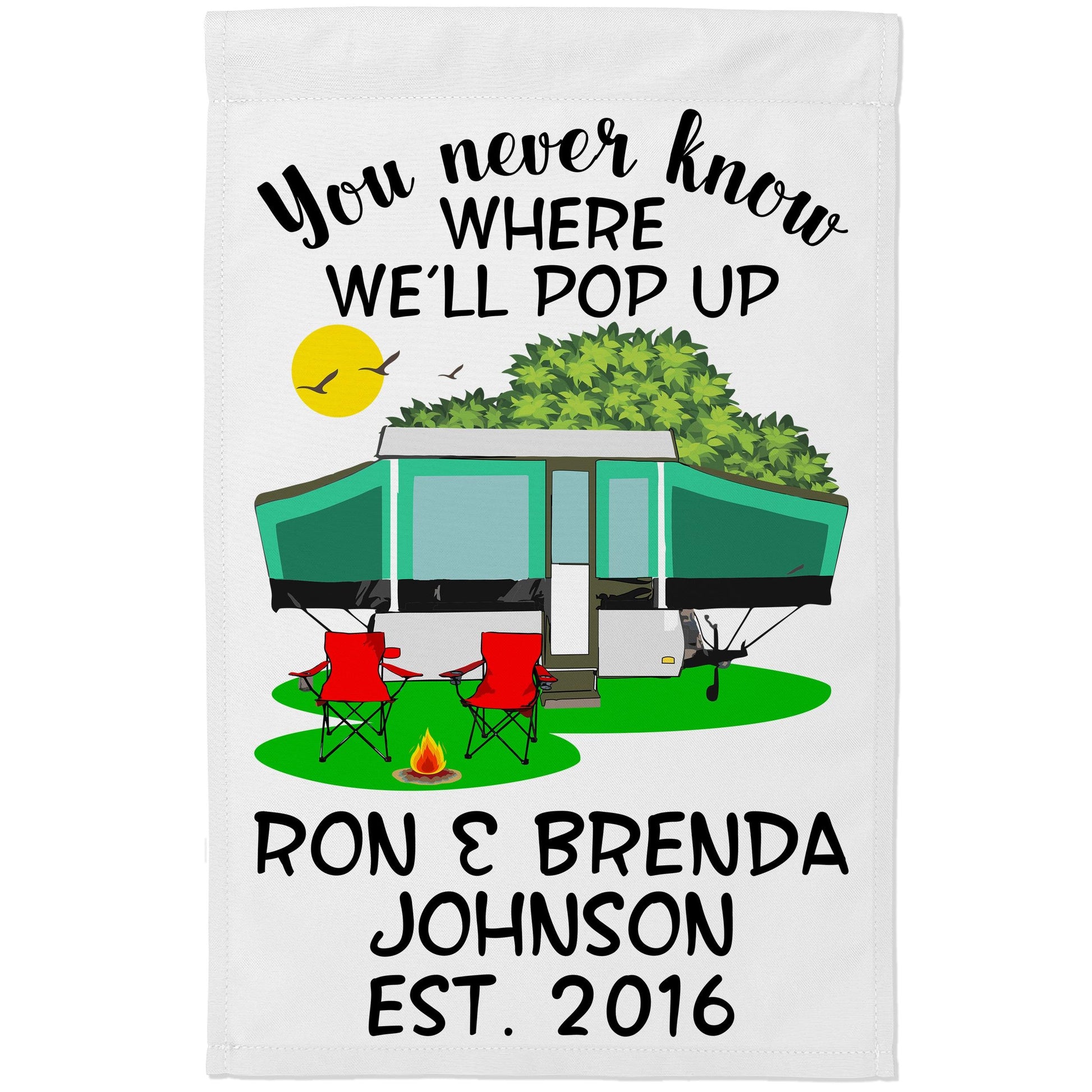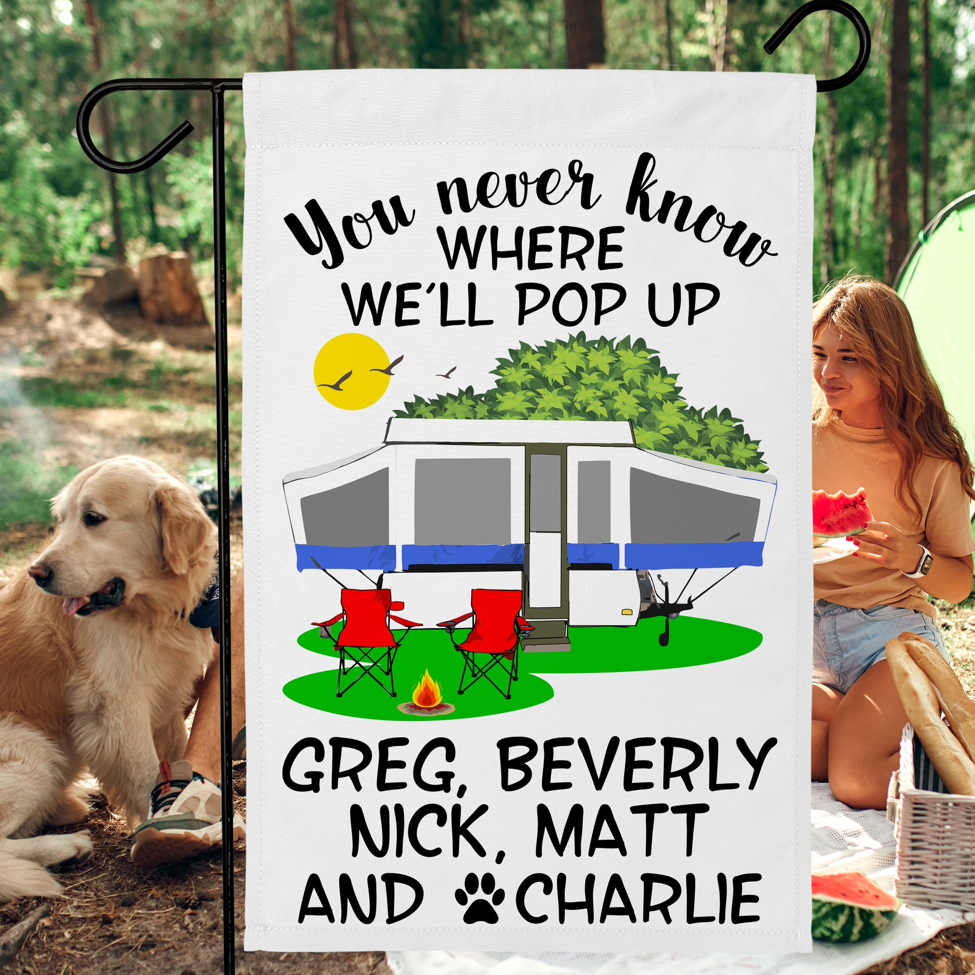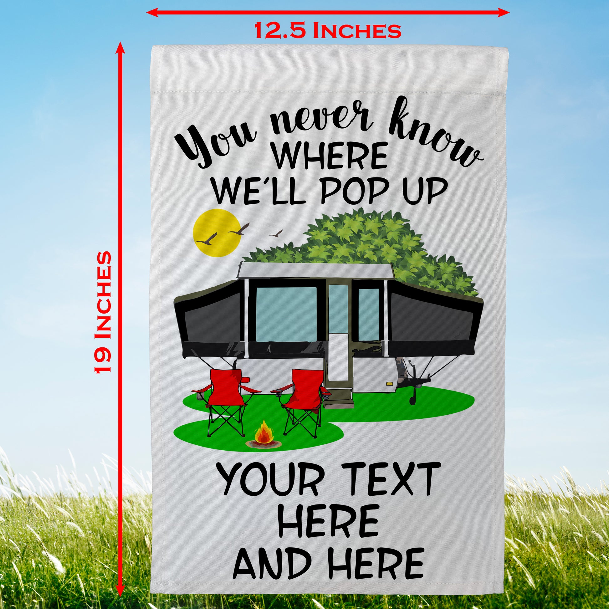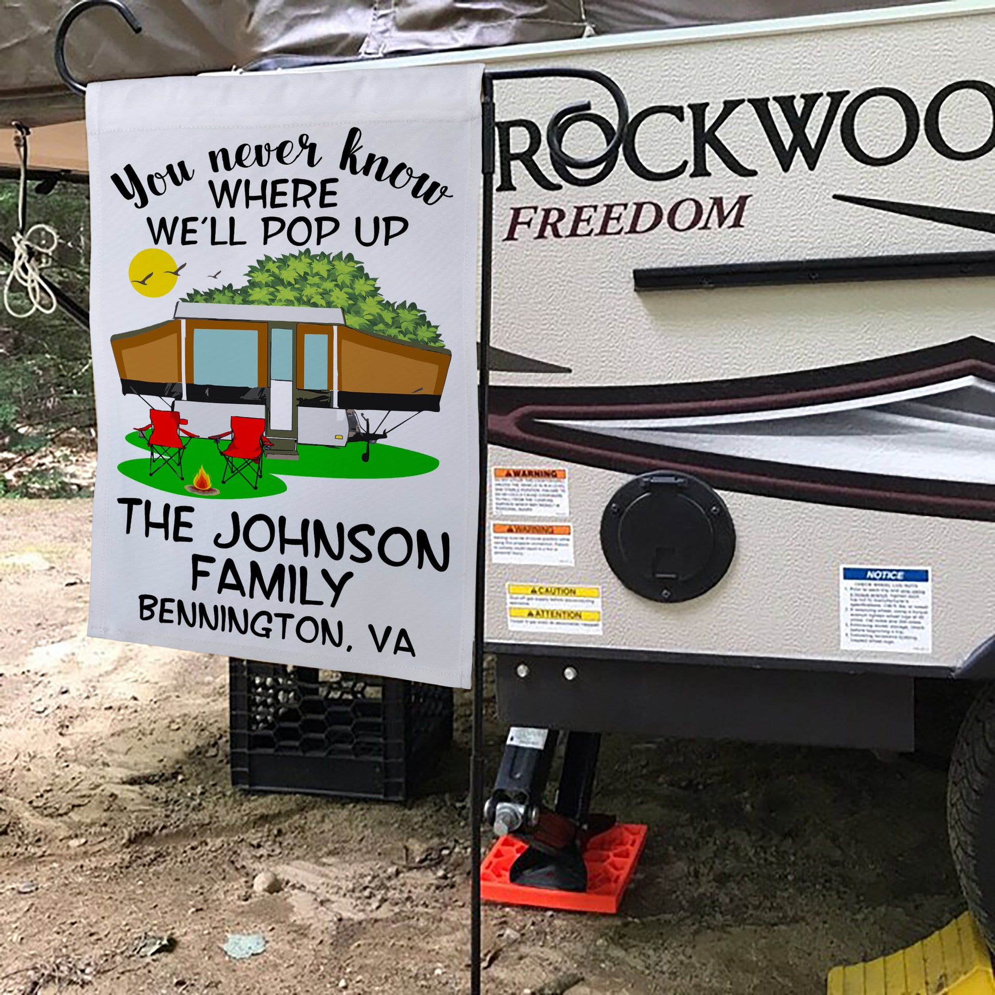 You Never Know Where We'll Pop Up Personalized Campsite Flag on White Fabric
