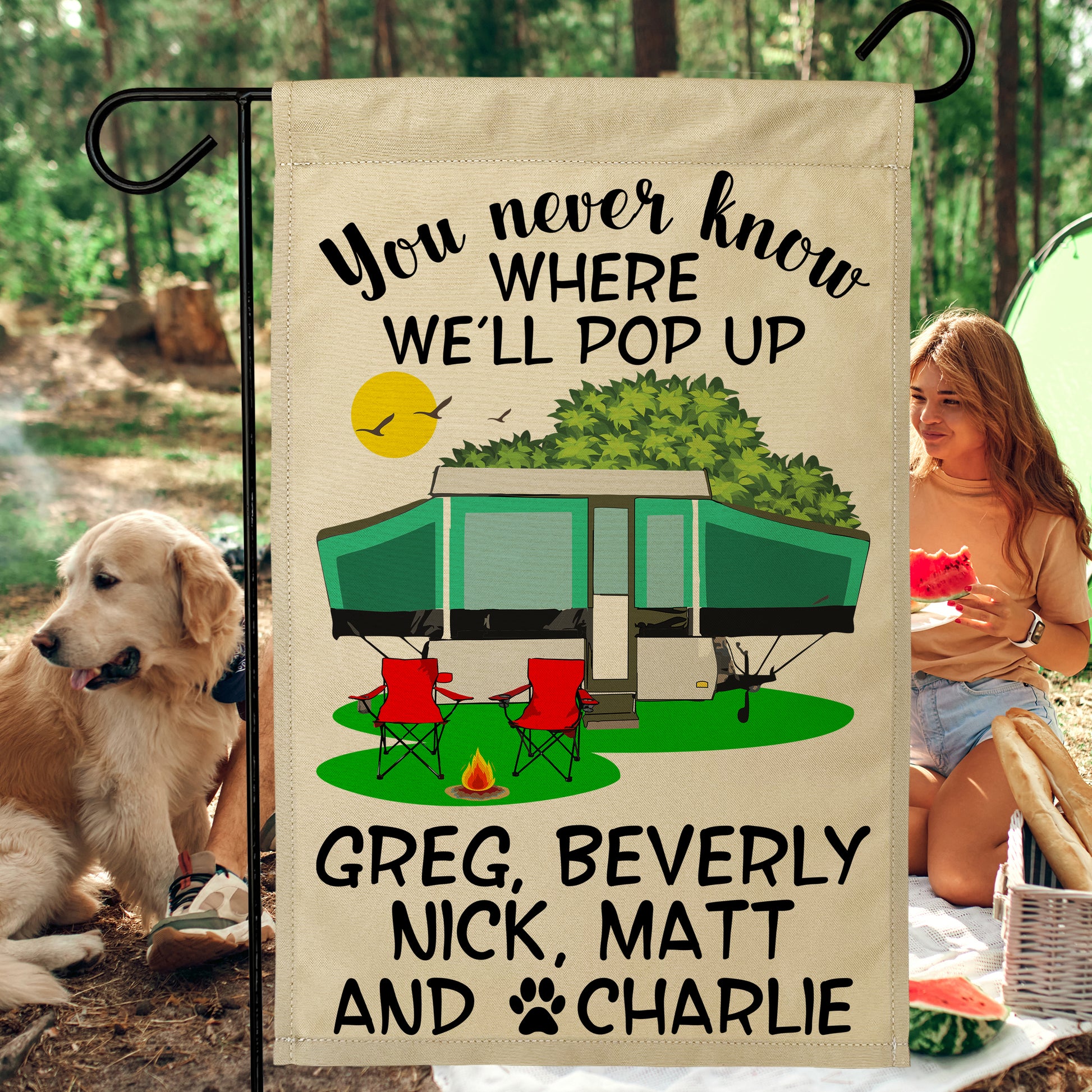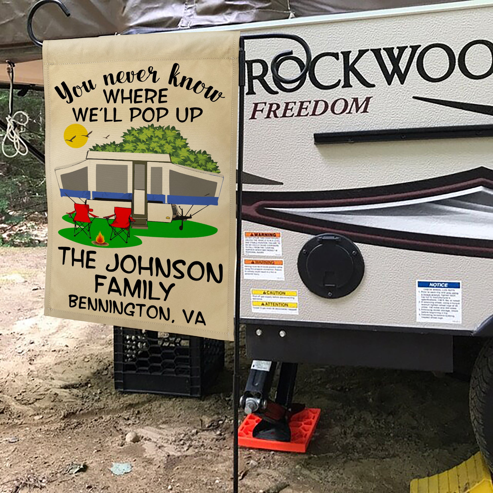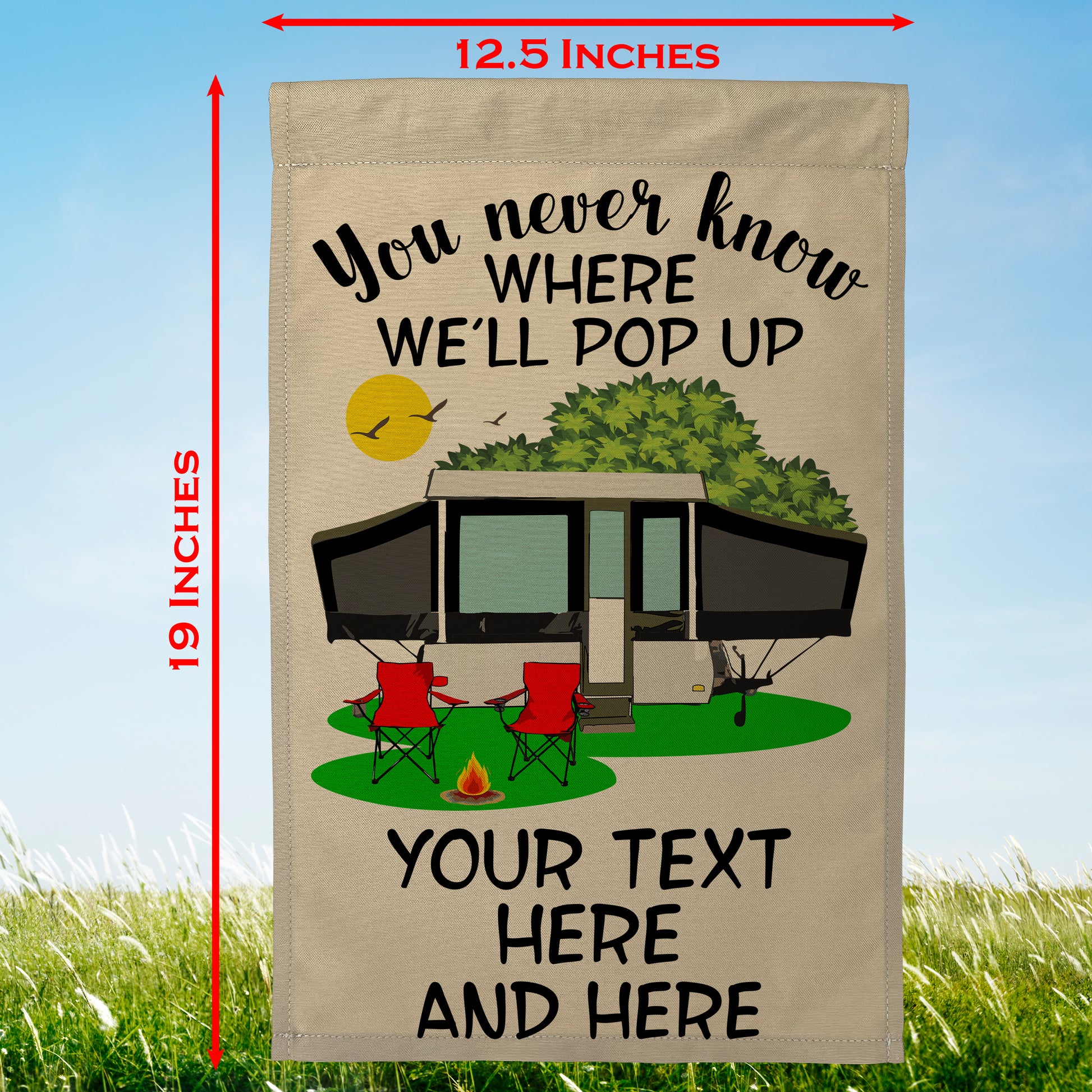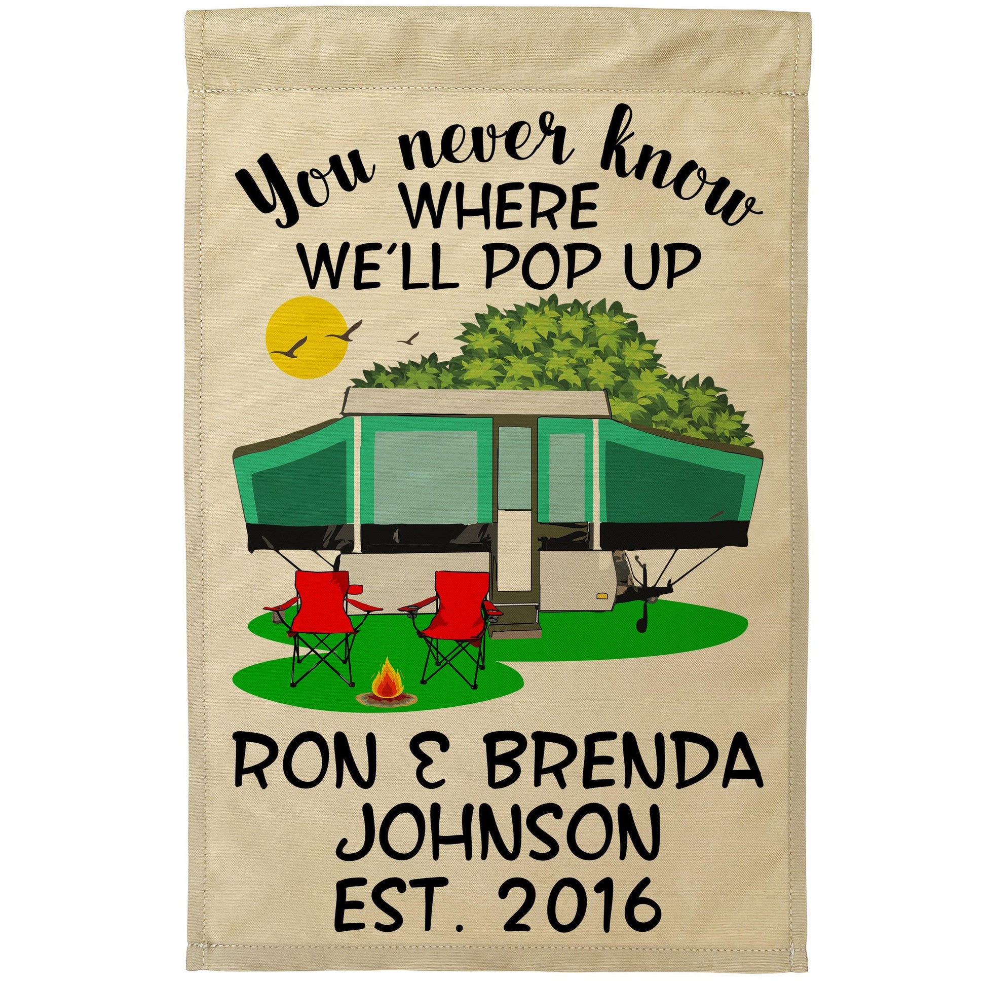 You Never Know Where We'll Pop Up Personalized Campsite Flag on Tan Fabric